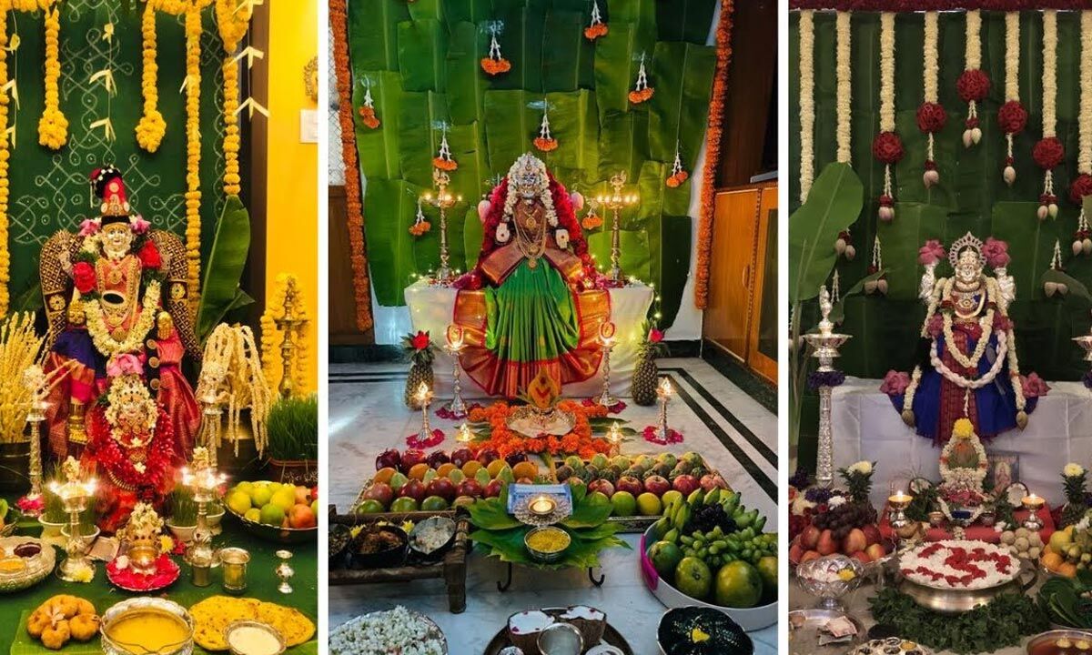 Devotees chant the mantra, “Om Shri Mahalakshmyai Cha Vidmahe Vishnu Patnyai Cha Dheemahi Tanno Lakshmi Prachodayaat,” to invoke the goddess. She is worshipped in her forms as Mahakali, Mahalakshmi, and Mahasaraswati. Offerings such as roti, payasa, karjikai, holige, and ghee-based delicacies are prepared and presented as naivedya (sacred offerings). In the evening, married women are invited, and gifts like turmeric, kumkum, flowers, fruits, and bangles are offered. Guests are honored with bagina (gift bags) after the puja, fostering social bonds.