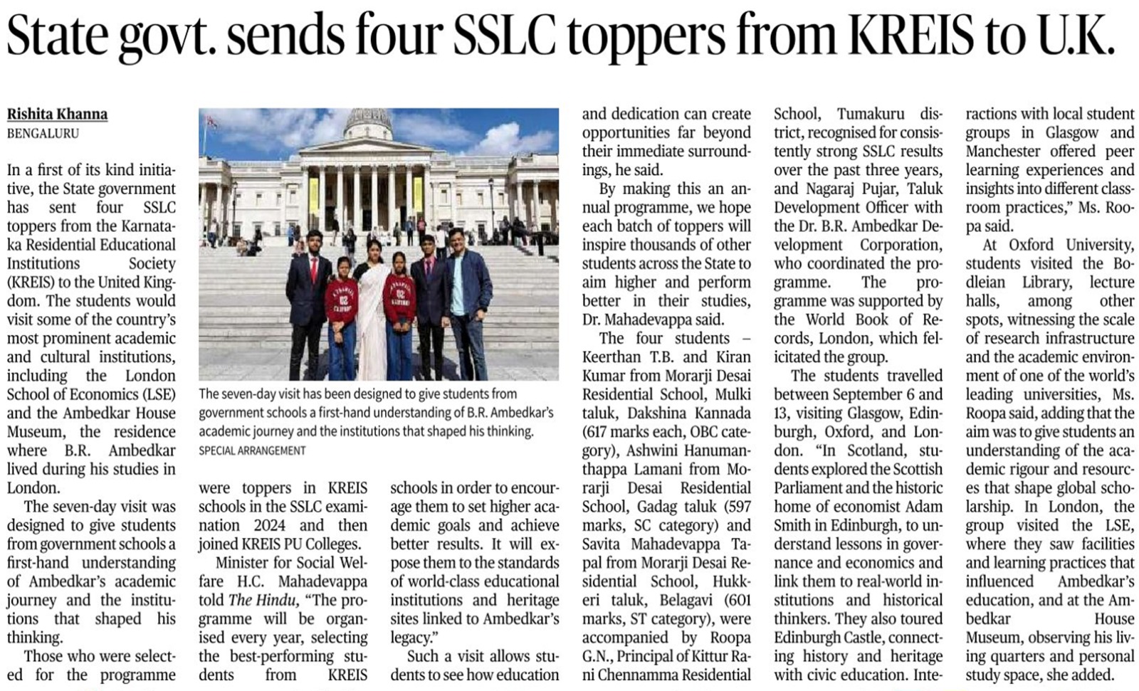 The Karnataka Government, through a unique and groundbreaking program, has sent four high-achieving students from Karnataka Residential Educational Institutions Society (KREIS) schools, who excelled in their SSLC examinations, on a week-long educational tour to the United Kingdom. These students visited prestigious institutions such as the London School of Economics, Oxford University, and the Ambedkar House Museum, retracing the educational journey of Dr. B.R. Ambedkar.