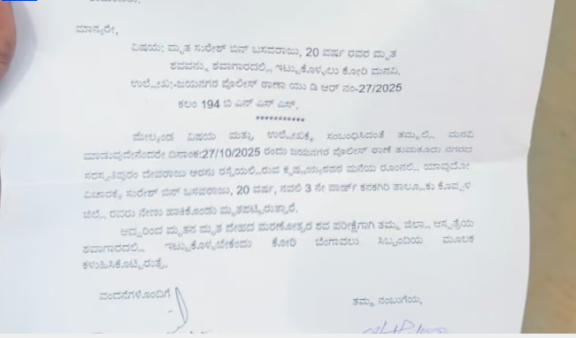 ' Alarmed by the post, his parents immediately tried calling him but received no response. In a panic, his father rushed from Koppal to Tumkur, only to confirm the worst—his son had taken his own life by hanging. Suresh's body was sent to the district hospital for post-mortem examination. On the surface, the incident has been confirmed as a suicide. Expressing suspicions about the circumstances leading to his son's death, Suresh's father lodged a complaint at Jayanagar Police Station. A case has been registered, and investigations are underway.